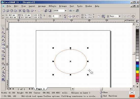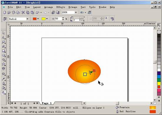 3.这时候的填充,可能你还不太满意,可以选择Fill Tool下面的Interactive Fill Tool来调整。这是CorelDRAW独一无二的交互式填充工具,你可以即时看到效果,十分方便。调整在椭圆上显示的色块和箭头,使它如图所示。(3)