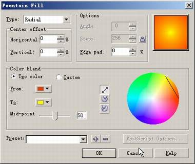 2.在椭圆被选择的情况下,点击Fill Tool—Fountain Fill Dialog,将对话框中的参数设置如图(2)所示:Type选择Radial,Color Blend选择Two Color,From选择Red颜色,To选择Yellow颜色。