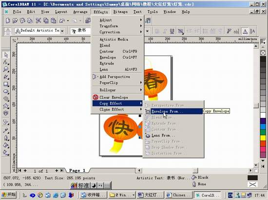 10.选择Text Tool,打出“新”字,将其放到合适的大小,用Interactive Envelope Tool—Preset List—Envelope 1给它加上圆形封套,再用Interactive Transparency Tool,让字看起来象写在灯笼上的。(12)其他几个字的封套和透明效果可以用Effects—Copy Effect直接从“新”字的属性复制过来。(13)