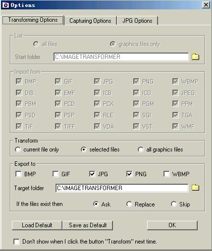 图3在转化栏(Transform)里,你可以选择转化(1)当前的图片、(2)选中的图片、(3)所有的图片。在导出栏(Export to )里,你可以同时选择多种的导出格式,转化后的文件的所要存储的文件夹,如果该文件存在该如何处理。选好后点击“OK”。完成转化。如果你要转化一批图片,建议你将它们弄到同一个文件夹下,然后选择工具栏上的