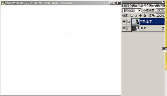 将副本图层下拉菜单选为“颜色减淡”,这时图片会亮得几乎什么也看不见,不要急,慢慢来。