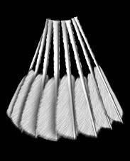 图14 Photoshop制作羽毛球的三步曲已经完成了,下面就是”拼图”了,在layer面版中,调羽毛部分在底层,“球头”和固定线部分(要复制两条)放置在羽毛部分之上,别忘了,也要给“球头”和固定线Layer-->Layer Style-->Drop shadow添加阴影效果。最后的效果就出来了(图15),还行吧!你是不是也要亲自来试试。