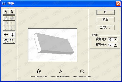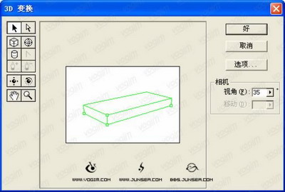 3.选择左侧工具条上的‘轨迹球工具’,来旋转四方型轮廓,在旋转过程中如果长方体被转到了画布以外的话,可以用‘全景相机工具’来将长方体拖回画布中。完成旋转后如。然后再点击设置面板右侧的选项按钮,将分辨率设置为‘高’,消除锯齿也设置为‘高’,并取消‘显示背景’的设置。完成后如图。