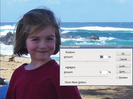 图022、选择Image > Adjustments > Shadow/Highlight(图03),神奇的事情马上就发生了(图04),小女孩脸部的光线立刻明朗起来,我们通过键入数字或滑动滑竿对shadows和highlights分别进行调节,数值越大,阴影处就越明亮,而高光处光线就越暗,多试几次,直到达到理想的效果,是不是很简单?