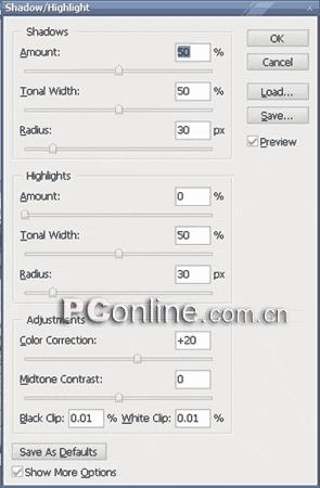 控制被修改的阴影或高光的色调范围。向左滑动是减少色调范围的值,反之亦然。如果Tonal Width选项的值很小,那就意味着你所调节的区域将限制在阴影中最暗的一小部分,或者是高光中最亮的一小部分。如果Tonal Width是个较大的值,那么你在调整阴影或者高光的时候可能也会影响其他,诸如中间色调。当Tonal Width的值大到100时,就相当于直射光的调节,也就是说做全局调整。这一选项很重要,默认的是50,但是我们在调节的时候应该根据照片的不同进行改变,如果Tonal Width的值太小,会使我们调节的效果不明显;但是偏大了,很有可能造成阴影和高光部分衔接不自然,这一点要切记。