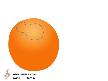 图24.用钢笔把橙子表面的受光面画出来(图3),并转换为选区,再到菜单-选择-羽化,羽化10个象素。按CTRL+M将羽化的区域的颜色稍微调亮些(图4)。