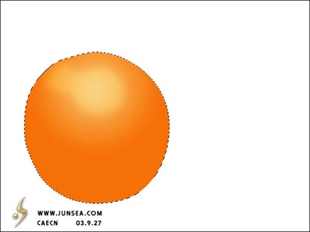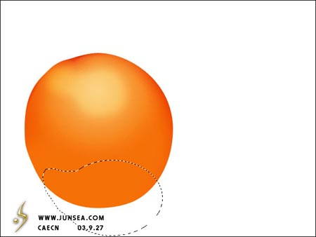 7.用CTRL+M将选区内的部分调节的亮一点,还有,因为光是从下面打的,那么越是橙子的底部的反光就越是强烈,也就是说越是底部的颜色就越是发白,如何让它颜色发白呢?也很简单,用工具箱中的减淡工具在橙子的底部涂抹几下就可以实现了(图7)。