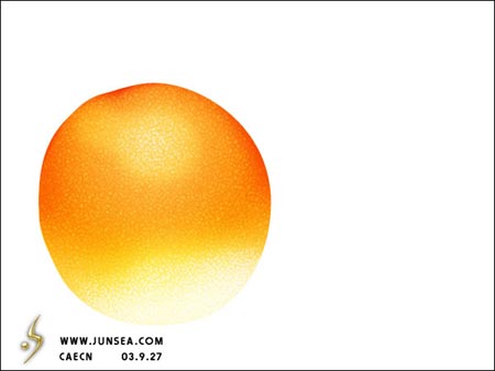 8图3735.回到橙披部分作进一步修饰,可用画笔工具,将前景色设置为白色,笔触大小为2个象素左右,在橙子表皮上的突起出点一些小点,然后用一下模糊工具稍微涂抹一下,来做橙子表皮的高光(图38)。