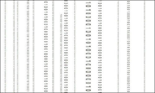 2.用文字输入工具随意输入一窜01代码,并按CTRL+T把它垂直旋转过来放,并多复制几个拉成不等大小,随意摆放几个(图1)。还有一种方法,是用滤镜,也可以达到很不错的效果。就是菜单-滤镜-纹理-颗粒,把强度和对比度都调至100,颗粒类型选择垂直就可以了。