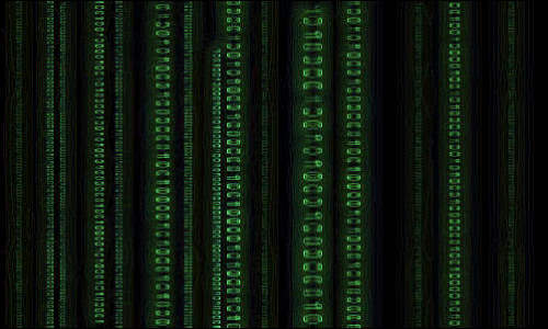 3.把那些01代码的文字层和背景层全都合并起来,并把前景色设置为R:100、G:255、B:0左右的绿色,背景色设置为黑色(图2)。