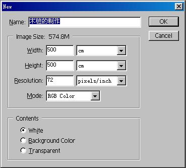 3.在name对话框输入文件名:“木桩的制作”。设定Width(宽度):500 pixel(像素), Height(高度):500 pixel, Resolution(分辨率):72pixels/inch,Mode(颜色模式):RGB Color, 在Contents栏下点选White,设定完后单击OK按钮。