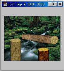 最后合并图层。然后再打开一幅风景图,把自已做的木桩复制到风景图上。这样木桩就做好了(图27),怎么样漂亮吗?