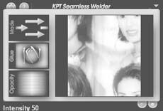 2、 从滤镜下拉菜单中选择KPT3中的Seamless Welder滤镜,在出现的对话框中设置Mode为Seamless Welder,Glue为Normal,Opacity为100%,在预览窗口中拖动鼠标,看左下角的提示栏,使Intensity(强度)为50%左右,我们可以通过滤镜右上角三角形下拉菜单中的Preview Edge Matching来预览边缘融合情况,然后按右下角的绿色按钮执行该滤镜功能(如图6所示)。