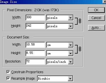 3.通过“image size“属性修改图象中的分辨率、宽和高等,将太大的原始图片改为适合自己的大小。这里我