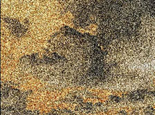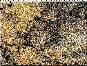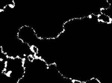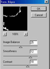 6.为了制作泥土的裂痕效果,单击菜单栏上的“Filter(滤镜)-sketch(素描)-torn edges(撕边)”,分别将“Image Balance(色彩平衡)”设为25;“Smoothess(平滑度)”设为12;“Contrast(对比度)”设为18,可得到有明显边界的纹路图像,其纹络形状和大小决定后面要制作的泥土纹沟,如果你不想要太多的裂痕,可用方框框选一部份按“Alt+Delete”键用黑色填充,得到如下效果图5。