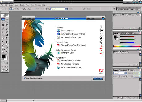 打开这个最新版本的photoshop,原来一贯的眼睛图像启动画面改成了彩色羽毛。启动后会出现一个大大的welcome screen(欢迎屏幕)。这个欢迎屏上有相关的教程链接和帮助信息,如果觉得碍事可以取消画面左下的复选框。