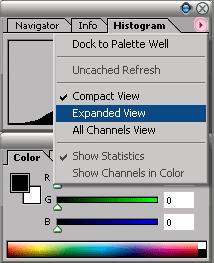 4.这个面板的作用是查看当前图像的明暗像素分布的直方图,以前直方图是作为一个菜单命令,Photoshop CS把它作为一个单独的面板。打开三角关联菜单,可以看到有几种显示选项。默认的是Compact View(紧凑查看方式)。我们选择Expanded View(展开查看方式)。