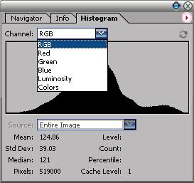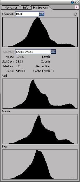 6.All Channels View(全部通道查看方式)可以看到全部的颜色通道直方图的信息,好像是一个扩展的色阶对话框,唯一的不同是Histogram面板只提供色阶分布信息查看,不能进行编辑。