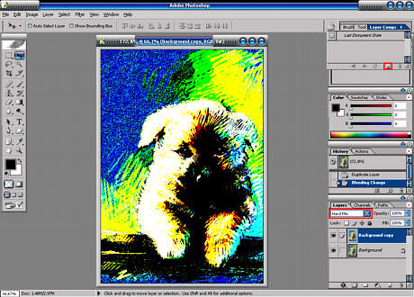 打开图片,复制图层,把混合模式改为一个新增加的Hard Mix(实色叠印混合)。虽然还不清楚这个新的混合模式有什么优势,至少用在当前的图像上的效果令人反胃,而且这个模式没有隐性中性色。在Layer Comps的面板中点击新建的图标按钮。