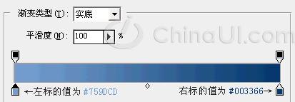 2、设置你的前景色为#759DCD,背景色为#003366。选择“渐变工具”里的“径向渐变”。并且确定,渐变编辑器里的左标为前景色,右标为背景色。然后从圆的左上部向右下部拉一个径向渐变出来。如下图: