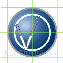 7、接下来,我们要做的就是其中的那个VW字样的关键部分,我们的思路是做两个相互交叉的“V”然后从中间截断。现在开始,选择字体“Lucida sans unicode”,然后写一个V,用Ctrl+T做一些简单变形。然后用钢笔工具描边路径,然后再用“直接选取工具”将它们的几个顶点延伸到圆上,如下图: