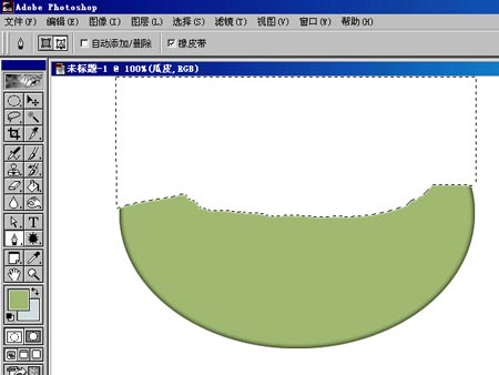 7.在背景上再建图层2,载入“瓜皮”层的选区,填充(89/110/60),取消选择,向下移动几个像素。选择图层1,也同样向下移动几个像素,载入图层2的选区,反选删除。