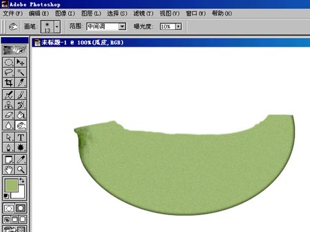 9.用橡皮檫降低压力修整瓜肉的左边,使下层的瓜皮显露出来(因为这部位是连接瓜藤的,皮会比较厚)。加轻微杂色约1.5。新建一层,填充50%灰色,执行滤镜-艺术效果-海绵(这个图兄曾指点过,偶得益不浅),大小1,定义2,平滑2。然后载入瓜肉的选区,反选删除,将混合模式设为“叠加”,降低不透明度为70%,向下合并到“瓜肉”层。这时你会发现,向下合并后图像变化了,在瓜肉的下沿出现一圈浅灰色!原来叠加是将下面所有的图层都叠加了,看不到的不要紧,看得到的可就出问题了,瓜皮被叠加后变深,而瓜肉下沿是羽化的,因此出现了灰色圈。弄了好一会儿才知道怎么解决,在合并之前,按CTRL+G将图层和瓜肉层编组,再合并就好了。