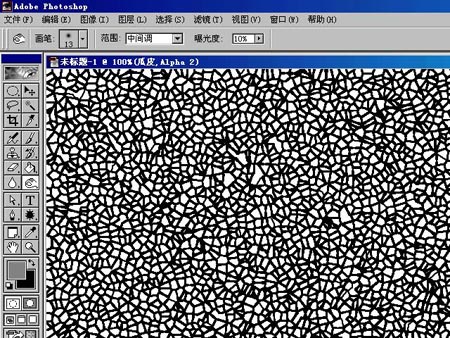 5.由于瓜的弧度,瓜皮的下部会看到一些的,不可偷懒。进入通道,新建ALPHA2,填充50%灰色,加10%杂点,执行晶格化,大小15,再执行查找边缘,按CTRL+L调出色阶,将黑色滑块往右拉到尽头。