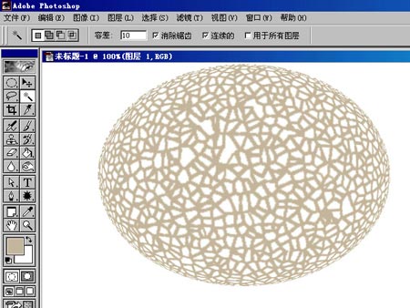 6.用魔棒选中黑色,回到图层,在背景上新建图层1,填充(200/179/154)。取消选择,载入ALPHA1选区,执行球面化,数量60,按CTRL+F再执行一次,反选删除,取消选择。(这时隐藏了瓜皮)