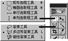 选取工具包括面罩工具、套索工具、魔术棒工具(如图5-1所示)。选取时区域用沿顺时针转动的黑白线表示。选取区域就是用来编辑的范围。一切命令支队选取区域有效,对选取外无效。下面我将分别介绍Photoshop的强大的选取工具。