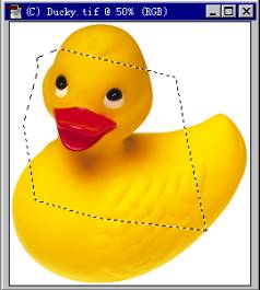 ,可以在图像中选取出不规则的多边图形。将鼠标移到图像点处单击,然后再单击每一罗甸,来确定每一条直线。当回到起点时,光标下就会出现一个小圆圈,表示选择区域已封闭,再单击鼠标即完成此操作(如图5-24所示)。Delete键和Alt键的操作和套索一样。多边套索的任务栏(如图5-25所示)也一样,这里就不再介绍了。