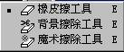 橡皮工具当然就是擦除颜色的工具了。Photoshop6版本中的橡皮工具与以往的版本有所不同,如图4-01所示,包括三个工具:橡皮擦工具,背景擦除工具,魔法擦除工具。
