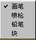 (2)方式——选择橡皮擦的擦除方式。其包括画笔,喷枪,铅笔,块。其效果类似于以前讲过的用这些工具绘图的效果。其方式菜单如图4-09所示。