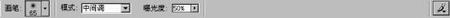 减淡工具和加深工具的任务栏相同,如图4-55所示。包括:画笔选项,模式,曝光率,笔刷动力。