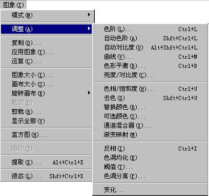 图中的菜单就是调整命令,它位于图形菜单下,其中包括:色阶、自动色阶、自动对比度、曲线调节、色彩调节、亮度/对比度、色相/色彩饱和度、去除彩色、替换颜色、选定颜色、通道混合者、反转、相等、阈值、色调分离、变化等指令。你可以根据当前的颜色以及颜色模式来选择,上一节的内容是至关重要的,学习本节之前你不妨再回顾一下上一节的内容。