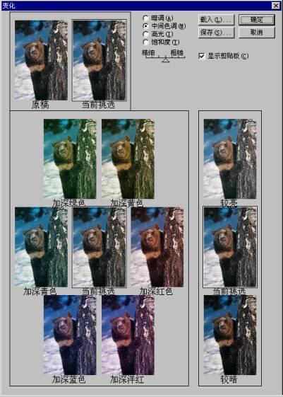 对话框顶部的两个缩略图分别为原图像(或原选区)和调整效果的预视图(或预视选区)。右面的缩略图是用来调整图像亮度的(单击其中一个缩略图,所有的缩略图都会随之改变)。中间的缩略图是反映当前的调整状况的。下面各图分别代表增加某色后的情况(如果要在图像中增加颜色,只需单击相应的颜色缩略图就可以了。如果要从图像中减去颜色,可单击色轮上的相对颜色)。