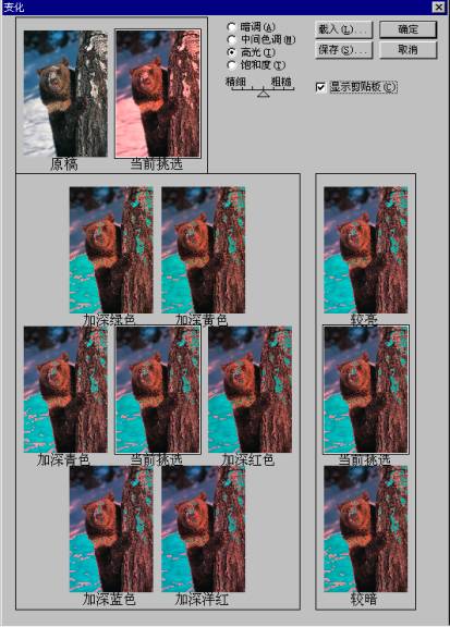 在进行调整时,效果最显著的变化就是直接比较图像调整前后的差异。Photoshop6中,执行这种操作的命令就是变化,是颜色调整菜单中的最后一项。变化实际上是由几个图像调整工具组合而成的一个容易使用的系统。可以用该命令调节图像的色相和亮度,通过缩略图来观察对比效果,然后用鼠标单击最满意的那个缩略图。变化对话框如图8-02所示。