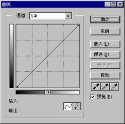曲线调整的对话框如图8-19所示,通道下拉列表选项栏和色阶相同,可以在这里对通道进行选择,使用方法也一样。打开对话框时,曲线图中的曲线处于缺省的“直线”状态。曲线图有水平轴和垂直轴,水平轴表示图像原来的亮度值,相当于色阶中的输入项;垂直轴表示新的亮度值,相当于色阶对话框中的输出项。