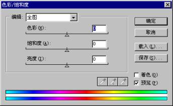 然后在编辑选项栏菜单中选择调整的颜色范围(选择全图选项可一次调整所有颜色,其他范围则针对单个颜色进行修改)。如果选择其它颜色范围,对话框底端的两条颜色条之间会出现一个调整色块。你可以用这个调整色块来编辑色彩。确定好调整范围之后,就可以利三角形滑块调整对话框中的色相,饱和度和亮度数值,这时图像中的色彩就会随滑块的移动而变化。