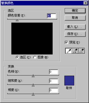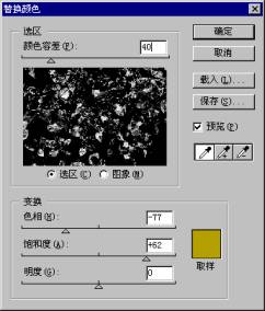 选项的具体用法是:先设定颜色容差值(数值越大,可被替换颜色的图像区域越大),然后使用对话框中的吸管工具在图像中选取需要替换的颜色。用“+号”吸管工具连续取色表示增加选取区域,“-号”吸管工具连续取色表示减少选取区域(也可以直接用Shift键增加和Alt键减少)。