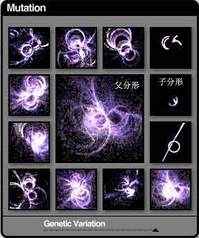由这七类基本分形样式可以衍生出无数子分形。每次你选定一种基本分形样式后,滤镜都会随机生成一个父分形显示在 Mutation 面板的正中,然后再根据这个父分形随机生成一组(12个)子分形显示在父分形的周围。面板底部的 Genetic Variation 滑块是用来调整子分形与父分形之间的差别。当滑块越靠近左边,子分形与父分形的差别越小;滑块越靠近右边,子分形与父分形的差别越大。