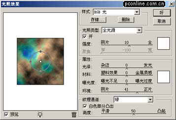 3.用光照效果滤镜为它增加层次感,具体参数和效果如下(图02)。
