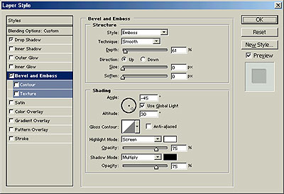 7、在层面板上单击混和属性打开层混和面板,选择Drop Shadow使用默认值加上阴影效果,选择Bevel Emboss然后按图所示设置。