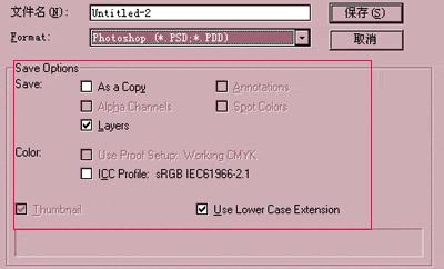 当按下存盘,你会发觉它的“Save Options”(存盘选项)改变了,例如是否存Layer、是否副本、颜色模式等。(上图)