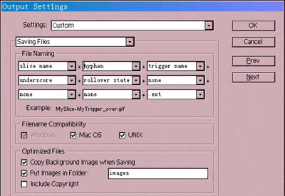 使用Save for web存盘时多了output settings选项:主要是文件如何设定、说明等,是一体化的存盘方式。(上图)