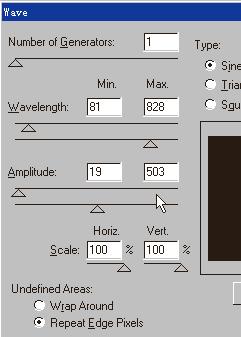 4.接下来,我们要模拟木纹那种随机的扭曲效果。呵呵,说的够明白了吧?还没想到用什么滤镜?选择菜单filter->distort->wave,具体参数请参照图二。得到的结果是,自然的扭曲出现了,但是太过于有规律性了。5.接着解决问题,选择菜单filter->distort->twirl,参数选择angle=94度。5 回到layer窗口,单击任意layer退出channel编辑状态。用快捷 图二