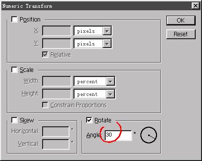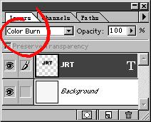 图二3. 在工具栏内选择文字输入工具(快捷键T),在文件中央输入你所需要 的文字,我这里采用Arial Black字体,大小25磅,颜色为黑色。并 将该文字层模式设到Color Burn(见图二),选择菜单Edit->Trans- form->Numeric,将该文字层旋转30度(见图三)。