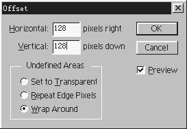 5. 选择菜单Filter->Other->Offset,将图像横移及纵移各 128pixel,并选中Wrap Around,如图五。图五