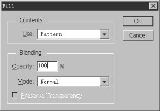 7. 到这里,这个范例算是大功告成,为了测试无缝 效果,选择Layer->Flatten Image合并所有层, 全选该文件(快捷键CTRL+A),选择菜单Edit-> Define Patten,新建一个比较大的文件如1000 X1000 像素,选择菜单Edit->Fill,选择use patten(如图七),就可以看到结果。 下次,将给大家介绍有关无缝纹理制作的高级技巧。 图七 二、无缝纹理制作高级技巧现在和大家讲讲无缝纹理的一些高级技巧。(一)十字选择法在通常情况下,许多纹理光进行offset处理,算然可以实现边界的接合,但是在图片中心会出现难看的接痕,通过学习下面这个范例我们可以学会如何消除这些接痕。1 新建一个大小为500X500dpi的文件。2 选择filter->other->clound,如图一。(在这里用clound只是随意生成纹理来试验十 字选择法。)