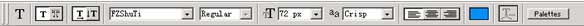 文字工具按钮中,取消了建立文字选择工具,但直接在工具栏中就可以设置。另外,在文字输入时,不用再弹出对话框,而是直接在图层中输入文字,然后文字的属性,如字体、大小、修饰效果等等都可以在工具栏中设置。这种输入方法就和CorelDraw等矢量软件非常相似了。